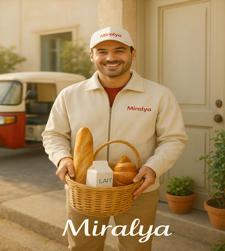 Miralya est heureuse, de vous livrer aussi votre lait, votre pain, votre croissant… au seuil de votre portes, et cela quotidiennement.